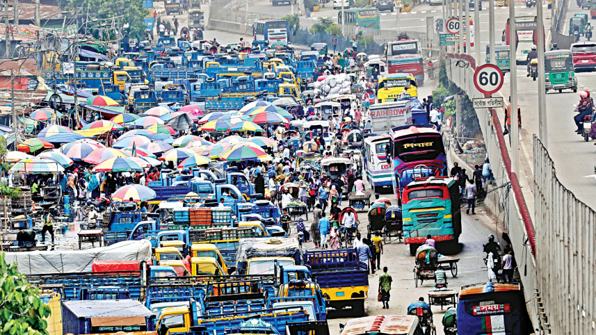 Parked pickups take up a large part of the Dhaka-Chattogram road next to the wholesale fish market in the capital’s Jatrabari, leaving little room for vehicles to pass through. The traffic situation is aggravated by some makeshift shops under big umbrellas. The photo was taken around noon yesterday. Photo: Palash Khan