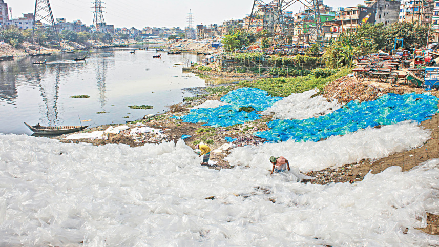 Workers drying plastic bags in the sun on the bank of the Buriganga in the capital’s Lalbagh so that they could be recycled. The bags, which had been used for packing chemicals, are washed in river, polluting its waters. The photo was taken recently. Photo: Rashed Shumon