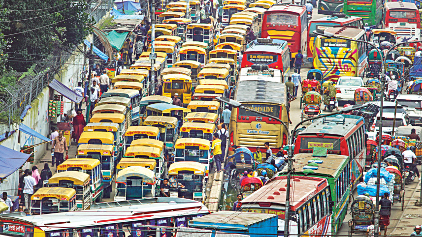 Illegally parked people carriers, popularly known as legunas, occupy a portion of the street in front of Golap Shah Mazar at Gulistan. It disrupts traffic flow on one of the busiest roads in Dhaka. The photo was taken yesterday. Photo: Rashed Shumon