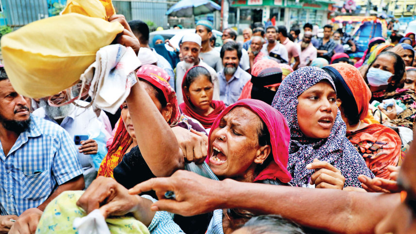 People push and shove each other to get close to an OMS truck to buy essentials at subsided prices in the capital’s Mirpur-1 area. They had waited in queue for a long time. The food department yesterday sold OMS rice for Tk 30 a kg and flour for Tk 24 a kg. Photo: Palash Khan