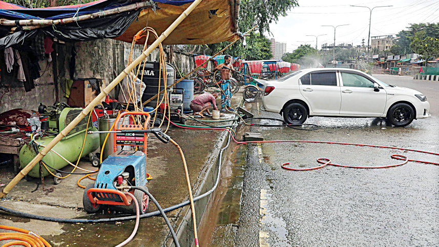 A car wash and repair shop has been set up occupying the footpath of this road in the capital’s Bhasantek. Rickshaws have also been parked on the sidewalk, obstructing the movement of pedestrians. The photo was taken yesterday. Photo: Amran Hossain