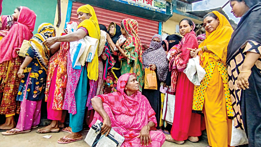 After waiting for hours in the queue in front of a TCB outlet, exhausted Kaburan Begum, 72, sits on the ground at Ershad Ali Primary School in Khulna town yesterday morning. Many with limited income are thronging such outlets to buy daily essentials at lower prices every day. Photo: Habibur Rahman