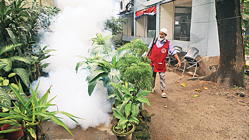 Anti-mosquito drives are now running in full swing throughout the capital. After the fall of the Awami League government on August 5, city corporation activities such as these had been halted for a few weeks. The photo was taken in Jatiya Press Club area yesterday. Photo: Amran Hossain