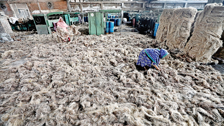 Two women workers sift through soggy jute fibres that were damaged by recent flash floods at a factory of Bangladesh Small and Cottage Industries Corporation in Feni. Most of the stored jute at the factory have been ruined, officials said. Photo: Rajib Raihan