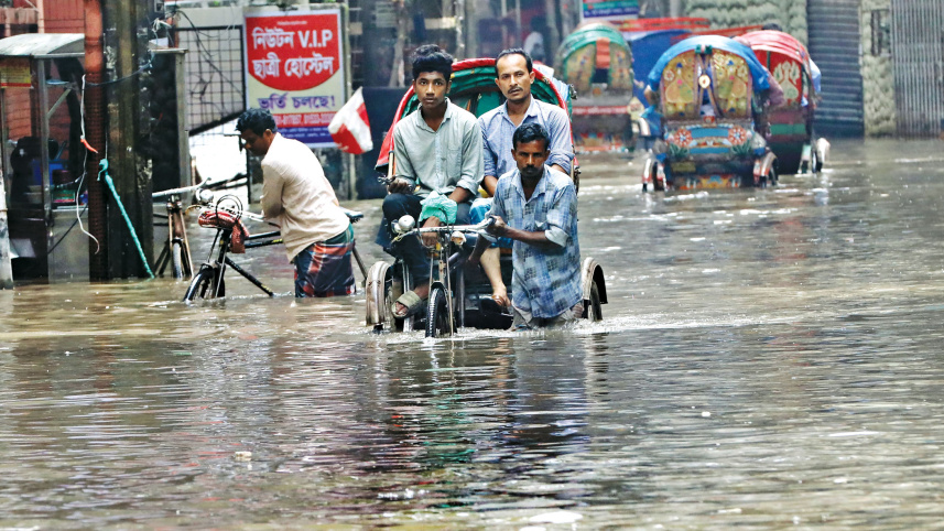 Rickshaws negotiate a waterlogged road in the capital’s East Tejturibazar around noon yesterday, hours after heavy rains. The downpours inundated many roads and alleys in the capital, causing sufferings to the city residents. Photo: Prabir Das