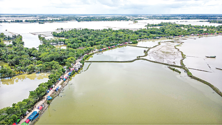 Makeshift tents line an embankment along the Bhadra river in Khulna’s Paikgasa upazila. Hundreds of villagers were forced to relocate here after their houses were flooded on August 22. These people have nowhere else to go as their homes were destroyed when a flood-protection dam was breached. The photo was taken in Harinkhola village under the upazila’s Deluti union. Photo: Habibur Rahman