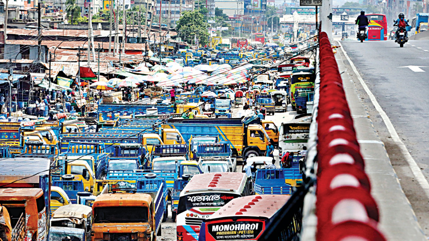Parked trucks and makeshift shops have more than halved the room for vehicles to pass on Dhaka-Chattogram highway in the capital’s Jatrabari, leading to traffic snarls. The photo was taken around 1:00pm yesterday from the Mayor Mohammad Hanif Flyover. Photo: Prabir Das