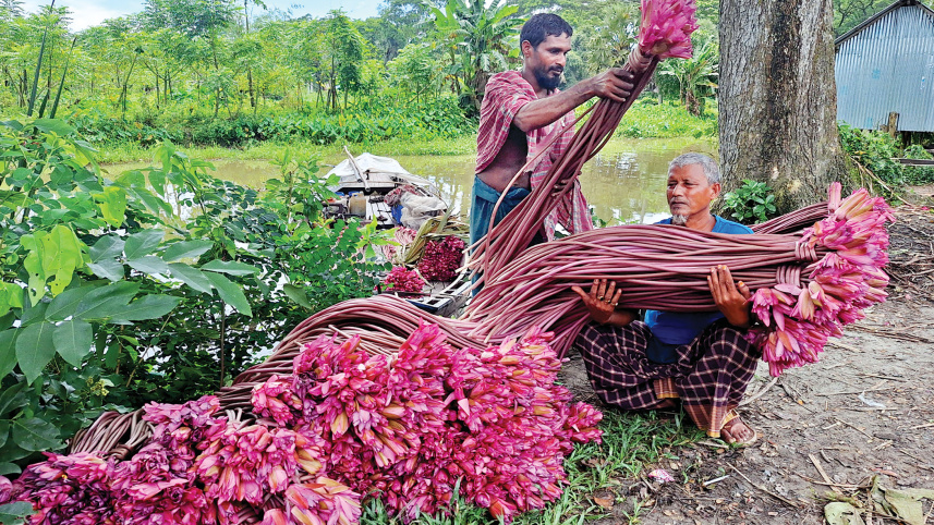 The shallow wetlands are teeming with red water lilies this monsoon. A hundred of these delicacies can fetch up to Tk 800 at the weekly bazaar. The photo of two people sorting them was taken yesterday from Daserpool Haat in Binoykati union under Jhalakathi Sadar upazila. Photo: Titu Das