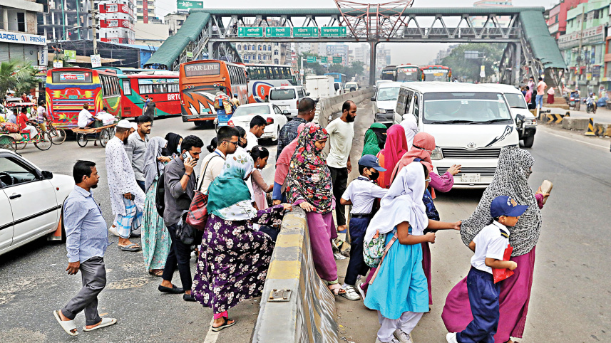 A number of people, some accompanying children, squeeze themselves between road dividers to cross a road in the capital’s Jatrabari, with a footbridge just a few feet away. The photo was taken yesterday morning. PHOTO: ANISUR RAHMAN