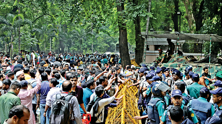 Protesters come face to face with law enforcers during a sit-in in front of the chief adviser’s residence in the capital yesterday afternoon. Law enforcers later used teargas to disperse them. PHOTO: ANISUR RAHMAN