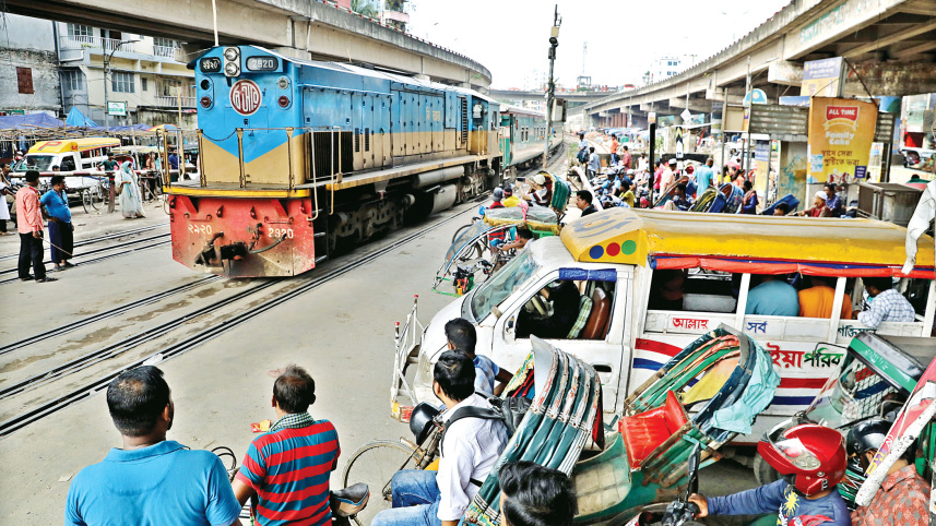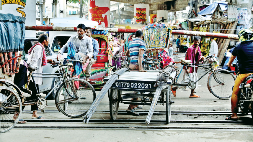 Despite the barriers being lowered, a rickshaw van and several rickshaws cross the Shahjahanpur rail gate in the capital through an open lane, putting both road users and train passengers at risk. Inset, vehicles going against traffic wait at the level crossing as a train passes by. The photos were taken yesterday afternoon. Photo: Anisur Rahman