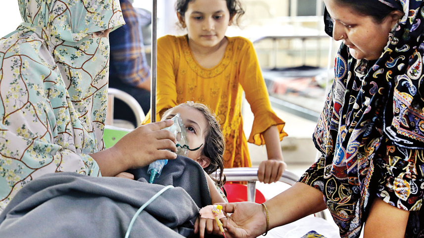 Four-year-old Afia surrounded by her aunt and sister as her mother nebulises her at a DNCC hospital in the capital’s Mohakhali yesterday. Afia was admitted to the hospital on the 12th with dengue. Due to the respiratory issues that come with the disease, she needs to be nebulised multiple times a day. PHOTO: ANISUR RAHMAN