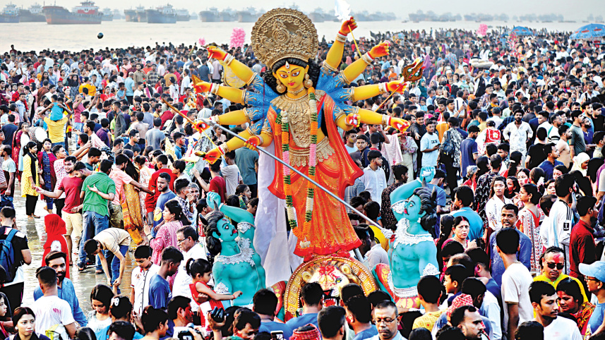 Thousands of devotees gathered at the Patenga sea beach in Chattogram to immerse the idol of Goddess Durga on Bijaya Dashami -- the final day of the Durga Puja festival -- yesterday. The custom of the immersion is symbolic of the departure of Durga to her home and to her husband Lord Shiva. PHOTO: RAJIB RAIHAN