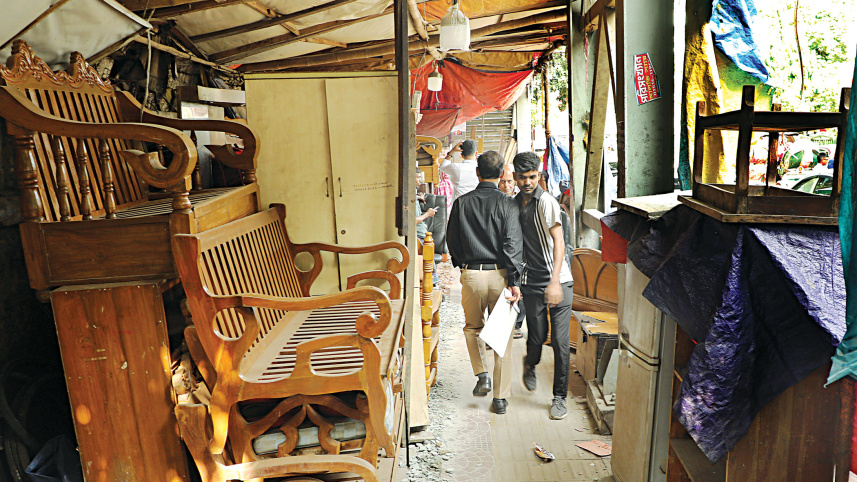 Traders have set up makeshift used furniture shops on the footpath right underneath the footbridge near Ideal School and College in the capital’s Motijheel, making it difficult for pedestrians to pass. The photo was taken yesterday. Photo: Amran Hossain