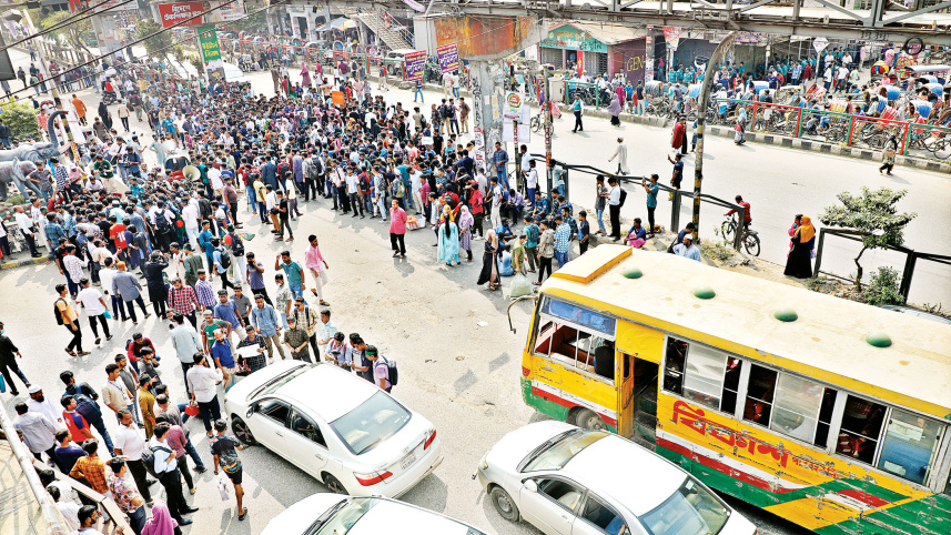Students of seven colleges affiliated with Dhaka University demonstrate blocking the Science Lab intersection yesterday demanding transformation of their colleges into a new independent public university. The protest led to heavy traffic congestion in and around the area. Story on page 3. Photo: Prabir Das