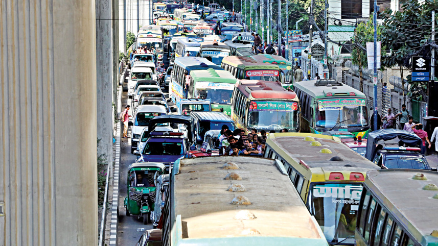Despite it being the weekend, heavy traffic locked down major areas in the capital like Karwan Bazar, Manik Mia Avenue and Khamar Bari. The situation worsened in the evening owing to the BNP’s rally. The photo was taken in the Bangla Motor area yesterday. Photo: Prabir Das