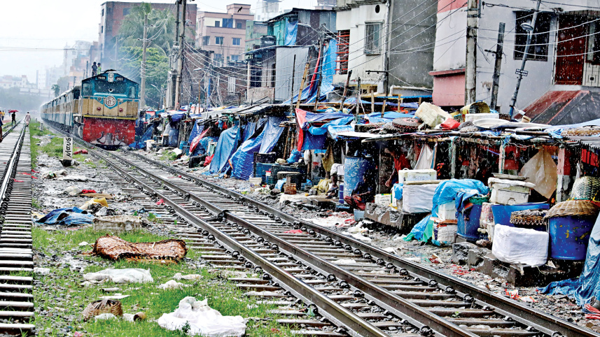 Traders have set up illegal makeshift shops along the rail tracks near the capital’s Malibagh Bazar level crossing, putting themselves, shoppers, and train passengers at risk. The photo was taken recently. Photo: Anisur Rahman