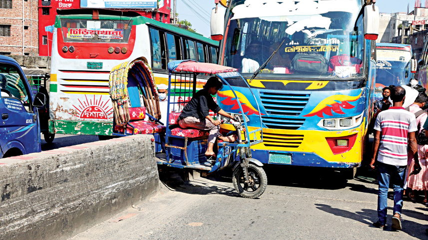 A battery-powered rickshaw takes a U-turn through a narrow opening in the median barrier on the Babubazar bridge in Dhaka, forcing traffic to stop. Locals say vandals broke the concrete barrier so that three-wheelers can take U-turns, violating the rules. Photo: Palash Khan