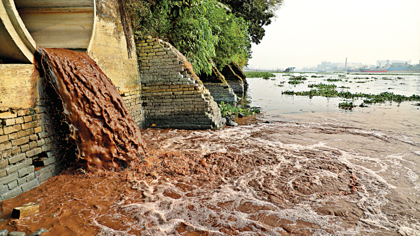 Liquid waste from chemical and dyeing factories being discharged into the Buriganga in the capital’s Shyampur area. Several fish species in the river have all but disappeared. The photo was taken recently. Photo: Palash Khan