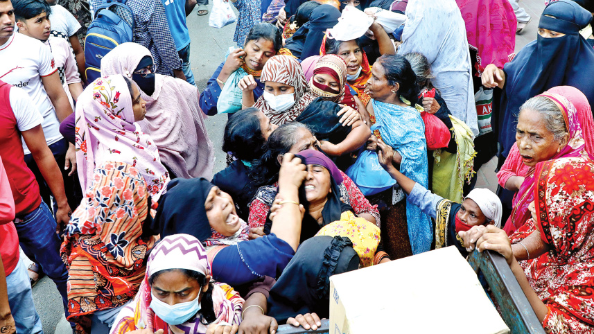 After having been waiting since 7:00am, these women from lower-income groups engage in a scuffle as desperation runs high for their share of kitchen essentials at subsidised prices from a TCB truck on the capital’s Manik Mia Avenue. The truck arrived around 12:00pm. PHOTO: PRABIR DAS