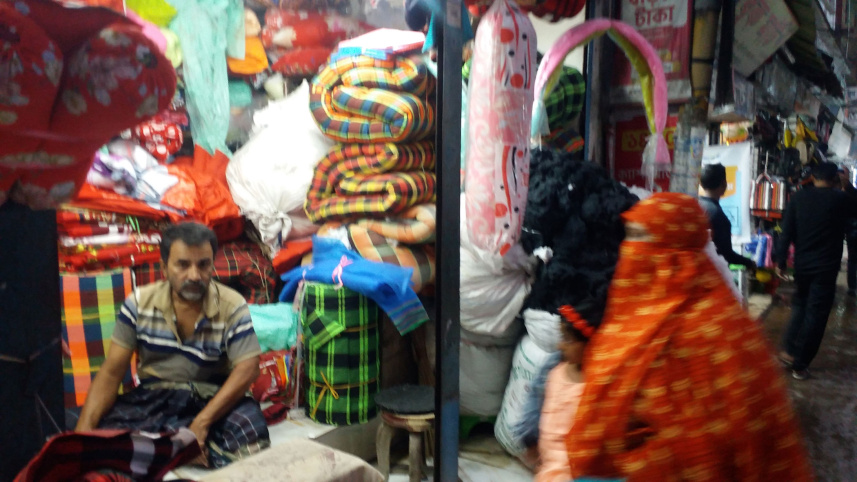 A quilt and mattress shop owner shows his products to customers. As winter starts to arrive, the demand for quilts and mattresses is on the rise. However, rising prices seem to be a common complaint among buyers. The photo was taken on Kazi Nazrul Islam Road in Bagerhat recently. Photo: Partha Chakrabortty