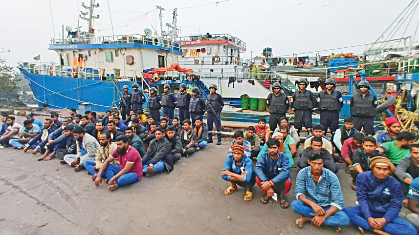An official X handle of India’s defence ministry published this photo of detained Bangladeshi fishermen on Tuesday night. The Indian Coast Guard detained dozens of Bangladeshis from two trawlers on Monday on charges of illegally fishing in Indian waters. Photo: Pro Defence Kolkata/X