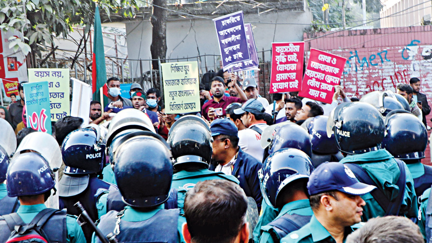 Police blocked protesters -- who oppose the age limit in government jobs -- as they attempted to march towards Shahbagh yesterday. The protesters had initially gathered at TSC, Dhaka University, and planned to march to the National Museum but were stopped by the law enforcers. Photo: Prabir Das