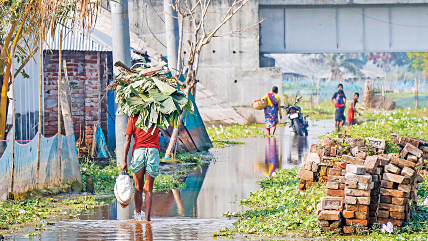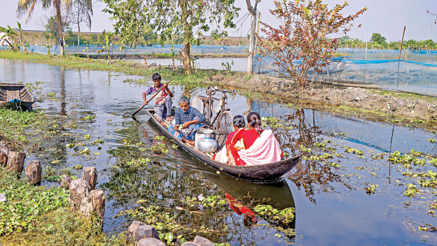 Incessant monsoon rains had left several villages in Khulna’s Dumuria upazila waterlogged, as the river drainage system was obstructed due to the collection of silt. After over four months, the situation remains the same and people have to now wade through ankle-deep cold water. Inset, a family using a boat to commute in the upazila’s Teligati village. The photos were taken recently. PHOTO: HABIBUR RAHMAN