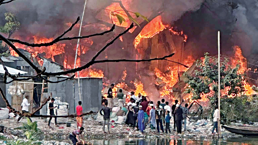 A fire broke out at Dhaka’s Korail slum yesterday afternoon. The cause of the fire could not be known immediately, and no casualties were reported. Photo: collected