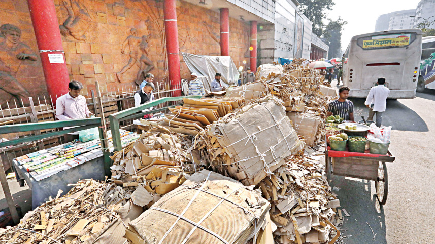 Piles of cardboard -- abandoned on the roadside after the truck that was carrying them had an accident a couple of days ago -- occupy part of the footpath and road in front of the Bangabandhu National Stadium in the capital’s Gulistan area. Despite the truck being removed, the cardboard remains, causing inconvenience to pedestrians and traffic movement. The photo was taken yesterday. Photo: Amran Hossain