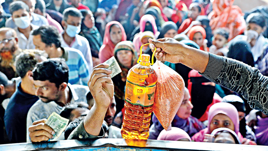 After a long wait, a man manages to purchase daily essentials from a TCB truck in front of Jatiya Press Club in the capital yesterday. As market prices remain high, hundreds of individuals flock to these trucks daily, hoping to buy essentials at subsidised prices. Photo: Anisur Rahman