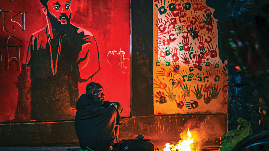 Beside a wall adorned with the graffiti of the July uprising, a homeless man warms himself by a small fire on a cold winter night. The photo was taken recently near Dhaka Residential Model College in Mohammadpur. PHOTO: RASHED SHUMON