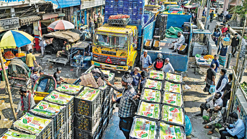 Workers unloading goods from a truck blocking the Sadarghat Gabtali Road near Ahsan Manzil. The road sees persistent traffic congestion due to this activity. Additionally, the footpath remains occupied during the loading and unloading process, further hindering pedestrian movement. The photo was taken yesterday. Photo: Rashed Shumon