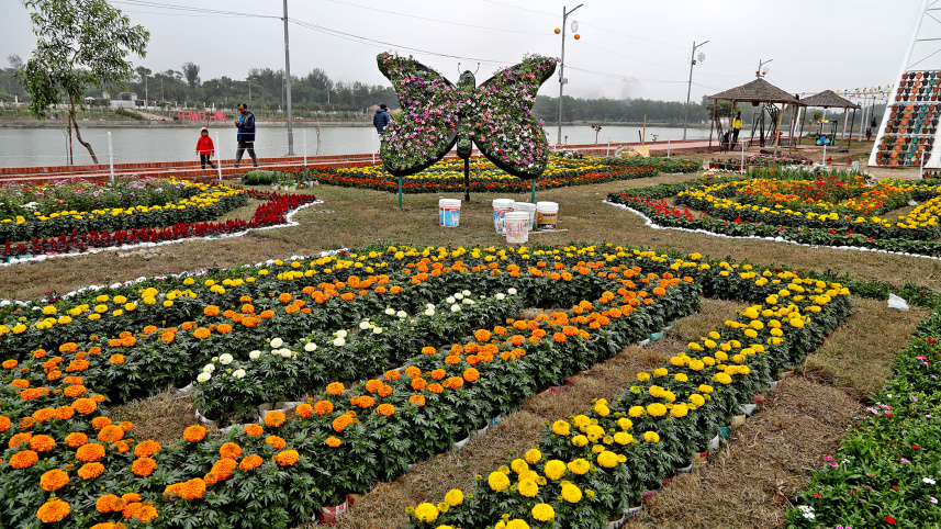 Preparations are ongoing for the month-long flower festival at the DC park in Faujdarhat. The event, organised by the Chattogram district administration, will kick off from today. Photo: Rajib Raihan