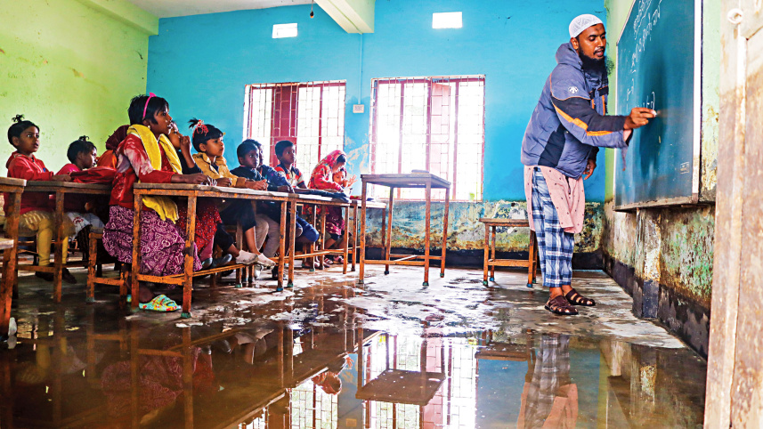 Even amid the harsh winter, teachers and students of Madhabkati-Bilpatiala Government Primary School are showing up to the waterlogged classrooms to ensure the children’s education is not hampered. Many parts of the No-2 Raghunathpur union in Khulna’s Dumuria upazila, where the school is situated, has been partially inundated for around six months now. As the drainage system in the area remains faulty, the school authorities have been trying to remove the water from the school themselves. PHOTO: HABIBUR RAHMAN