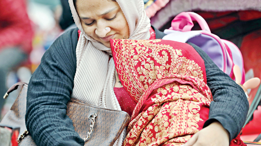 A mother gently cradles her child, wrapped snugly in a shawl, shielding them from the chill of a winter morning. The photo was taken in the capital’s Farmgate yesterday while they were returning home from school together. Photo: Prabir Das