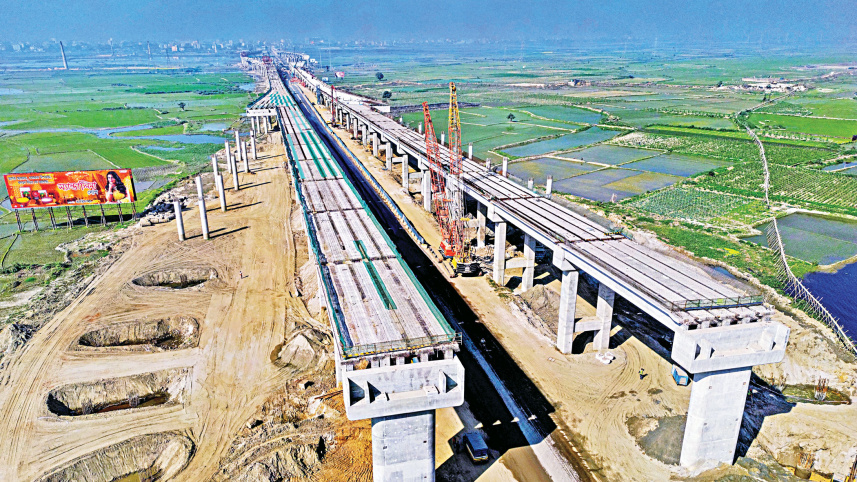 After a break during the July-August movement, the construction of the Dhaka-Ashulia Expressway, the second such expressway centring the capital, is now going on in full swing and saw almost 50 percent progress till December last year. Once completed, this 24km expressway – stretching from Dhaka airport to Dhaka EPZ – will be connected to the partially-opened Dhaka Elevated Expressway. The photo was taken yesterday. Photo: Rashed Shumon