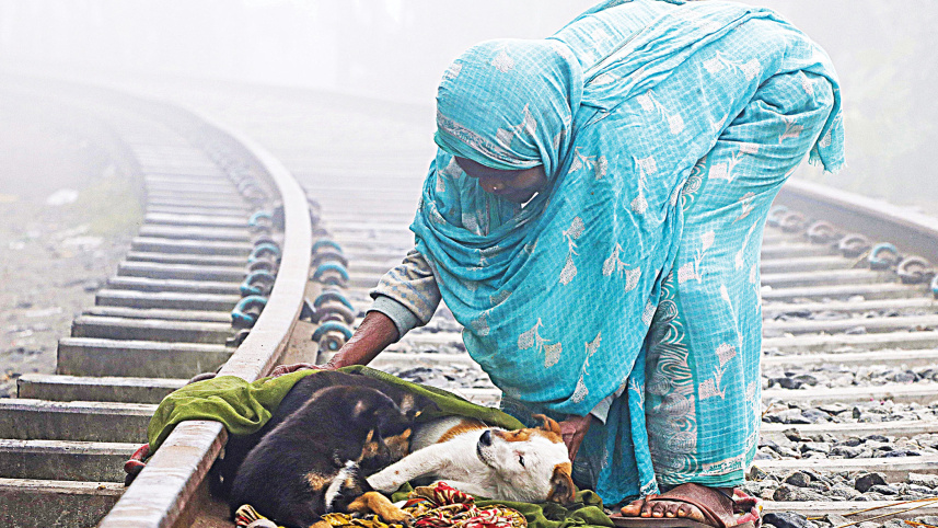 Halima, who lives near the Khulna Railway Station, woke up to see these two puppies shivering amid the heavy winter fog yesterday morning. She made sure to get some warm clothes to cover them up while they sleep. The dogs are not at risk as this particular rail track has been nonoperational for long. Photo: Habibur Rahman