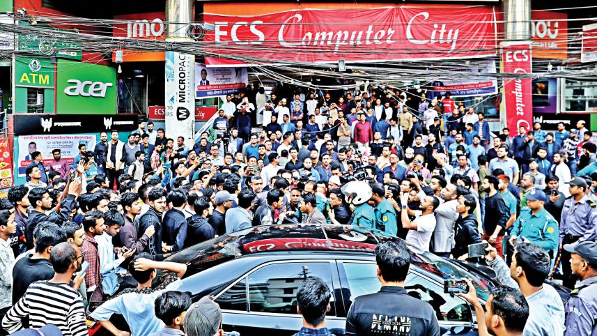 Protesting Friday night’s attack on two fellow traders by armed criminals, shop owners and employees demonstrated in front of the Multiplan Centre in the capital’s Elephant Road around noon yesterday. Adviser Asif Mahmud is seen arriving at the scene. He assured them of security and justice following which the trades withdrew. Photo: Anisur Rahman
