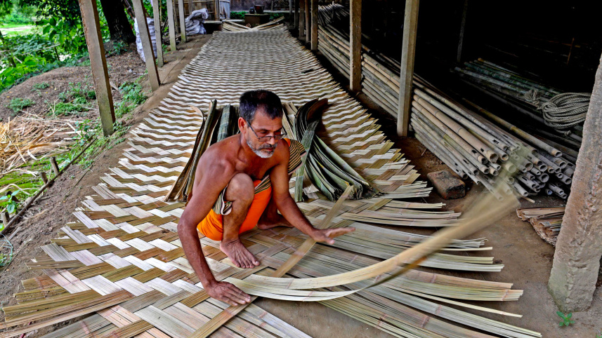 A man puts together multiple pieces of bamboo to make fences. This special type of bamboo is often used to make parts of houses in rural areas. Each 7.5 feet of bamboo sells for Tk 50-65. The photo was taken in Rangunia upazila of Chattogram yesterday. Photo: Rajib Raihan