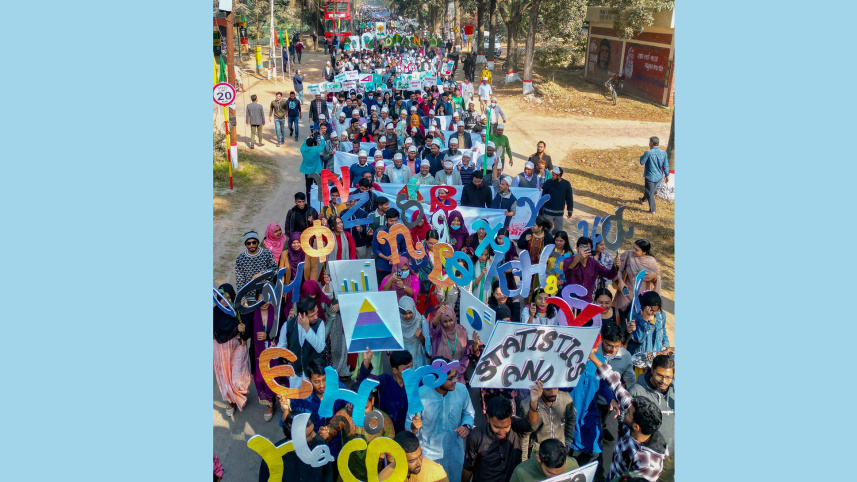 Students and faculties of Jahangirnagar University bring out a procession on the campus to celebrate the institution’s 55th anniversary yesterday. They marched carrying colourful banners and placards, honouring the university’s rich history. Photo: Auritro Sattar