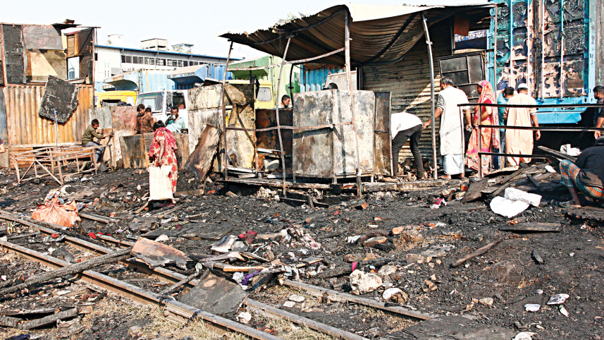 People try to salvage whatever they can after a fire broke out at a garage near the truck stand in Dhaka’s Tejgaon area yesterday around 8:00am. Six trucks and several shops in the area were gutted due to the blaze, which was eventually doused around 9:00am. Authorities are investigating the matter and the cause of the fire could not be known immediately. Photo: Prabir Das