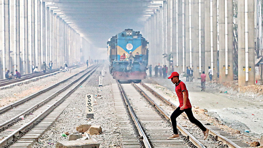 A man hops over the rail lines despite an oncoming train just 15-20 feet away from him. Even worse, three children sit on the front of the train. A slight misstep or mistiming could lead to an accident. The photo was taken in the Mohakhali Rail Gate area yesterday. Photo: Prabir Das