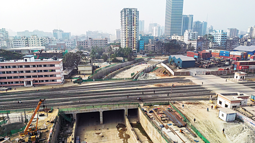 This photo of a construction site at TT Para, Kamalapur, shows the six-lane underpass project, which is being implemented at a cost of around Tk 100 crore. Upon completion, this infrastructure will allow vehicles to navigate smoothly via the underpass while trains can run uninterrupted on the railway lines above. PHOTO: Rashed Shumon