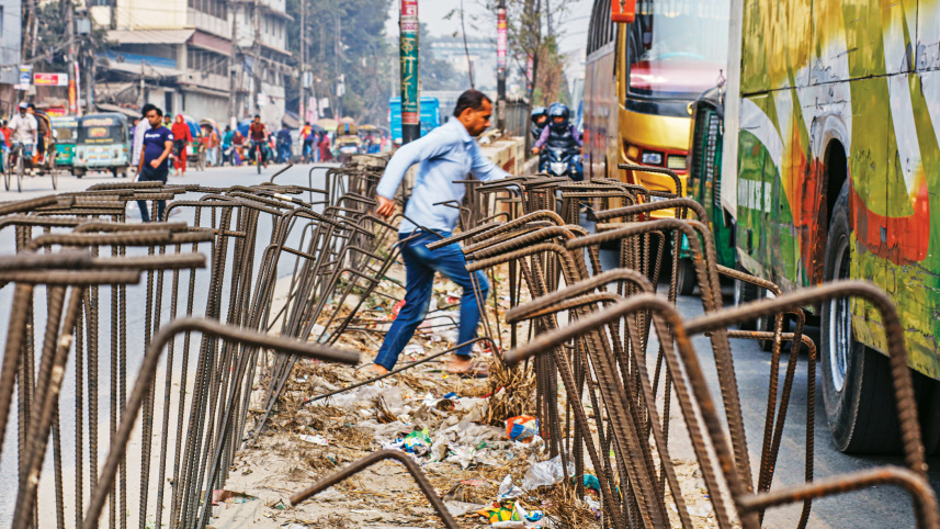 The construction of a median strip on Darus Salam Road in the capital’s Mirpur-1 area has been left incomplete for around a year, putting pedestrians and vehicles at risk. This photo was taken on Monday. Photo: Rashed Shumon