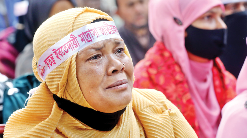 Fahima Aktar of Barguna in tears as she listens to a fellow madrasa teacher speak demanding their primary level educational institutions under the madrasa board be nationalised. Teachers of Swatantra Ebtedayee madrasas had been demonstrating in front of the Faculty of Fine Arts at Dhaka University since Saturday. They ended their demo yesterday. Photo: Prabir Das