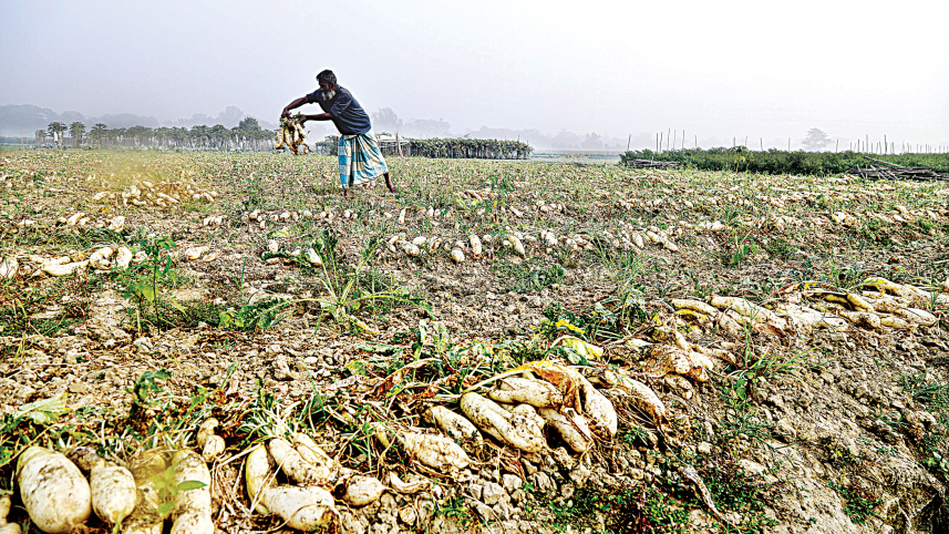 Farmer Abul Kalam won’t be taking his harvest of radish to the local market. He said there was no point in selling the produce in the local market since he has to pay Tk 150 fortransporting two baskets of the vegetable that he has to sell for just Tk 200, leavinghim no scope for recovering the cost of agricultural inputs and labour. Kalam said the radishes would end up in the Sangu river nearby. The photo was taken in Dohazari of Chattogram’s Chandnaish yesterday. Photo: Rajib Raihan
