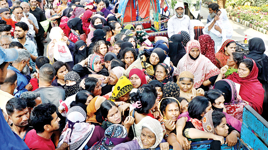 Buyers push and shove for subsidised essential commodities as soon as the TCB truck carrying supplies enough for only 200 people arrives in the capital’s Dhanmondi area around noon yesterday. Every day, people from low-income groups, who are unable to keep up with the soaring market prices of essentials, wait for hours for TCB trucks at various locations around the capital. Photo: Prabir Das