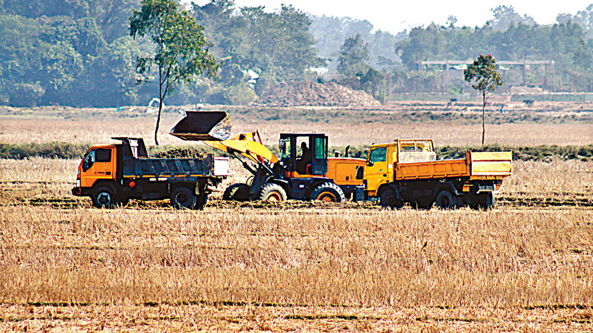 The topsoil of a farmland is being taken away in the Haripur area of Sylhet’s Jaintiapur upazila. This will make the soil unable to retain water, and the land will lose its fertility. Despite a ban, topsoil is sold to brick kilns and real-estate projects due to lax monitoring. The photo was taken recently. Photo: Sheikh Nasir