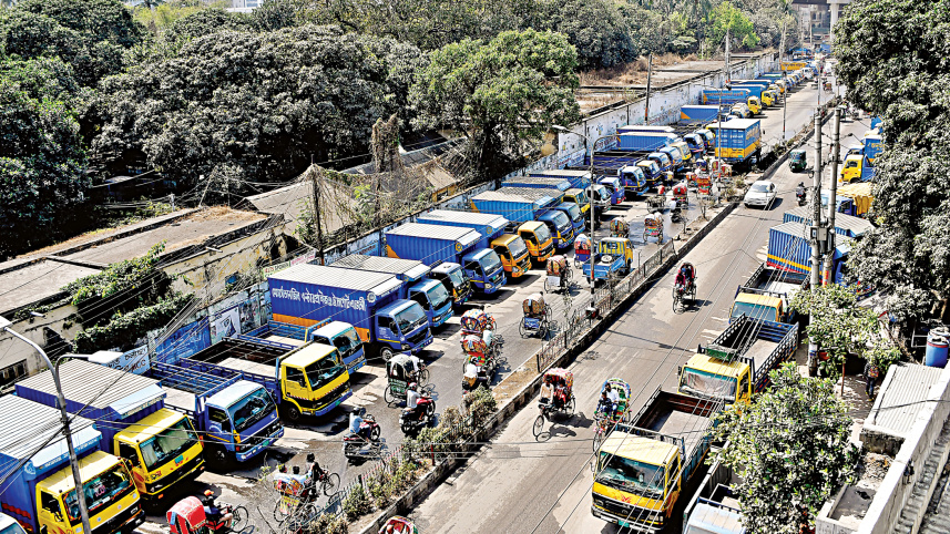 Parked trucks occupy several lanes on Mayor Annisul Huq Road in Tejgaon. Several drives to end this illegal activity over the years failed to yield a lasting result as truckers resume illegal parking there days after eviction drives. Photo: Palash Khan